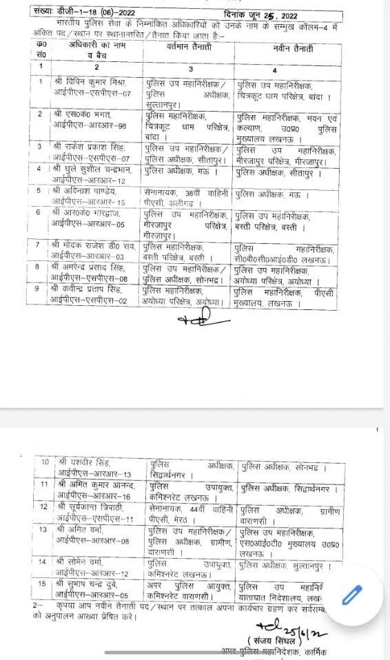 यूपी में फिर दौड़ी तबादला एक्सप्रेस: 15 आईपीएस अधिकारियों के तबादले, देखें पूरी लिस्ट