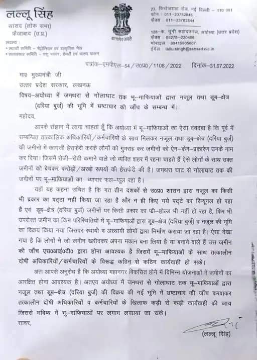 अयोध्या-फैजाबाद दोनों शहरों में चल रहे जमीनों के खेल में भू- माफिया, अयोध्या विकास प्राधिकरण, तहसील, राजस्व और नजूल विभाग शामिल हैं। बताया जाता है कि इन विभागों के अफसर से लेकर कर्मचारी तक इस कारनामे का हिस्सा है। बताया जा रहा है कि जब से अयोध्या सांसद लल्लू सिंह (Lallu Singh) ने एसआईटी जांच की मांग को लेकर सीएम (CM) को पत्र लिखा है तब से हडकंप मचा है।