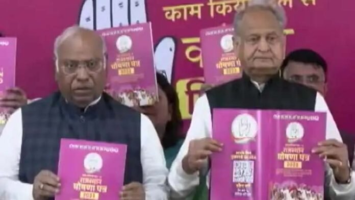 राजस्थान : राजस्थान में 25 नवंबर को विधानसभा चुनाव होने वाले हैं। चुनाव को नज़र में रखते हुए कांग्रेस ने आज मंगलवार को विधानसभा चुनावों के लिए अपना घोषणा पत्र जारी कर दिया है। इसमें किसानों, युवाओं और महिलाओं के लिए बहुत बड़ा ऐलान किया गया है। दरसअल कांग्रेस ने जयपुर में एक कार्यक्रम के दौरान घोषणा पत्र जारी किया चुनावी कार्यक्रम में पार्टी के राष्ट्रीय अध्यक्ष मल्लिकार्जुन खरगे भी मौजूद थे। मल्लिकार्जुन खरगे ने ही जयपुर में कांग्रेस के वार रूम से ये घोषणात्र जारी किया हैं। इस घोषणात्र में राज्य के किसानों, महिलाओं और युवाओं और व्यापारियों सभी को लाभ मिले इसका पूरा प्रयास किया है। इसमें 4 लाख युवाओं को सरकारी नौकरी देने का वादा किया गया है साथ ही 10 लाख युवाओं को रोजगार भी दिया जाएगा। किसानों के लिए MSP न्यूनतम समर्थन मूल्य कानून लाने की भी बात कही गई है। इसके अलावा बढ़ती महंगाई और महिला मुखिया को हर साल 10 हजार रुपए की आर्थिक सहायता दी जाएगी.और 500 रुपये में मिलने वाले गैस सिलेंडर को अब 400 रुपये में देने का वादा किया है।