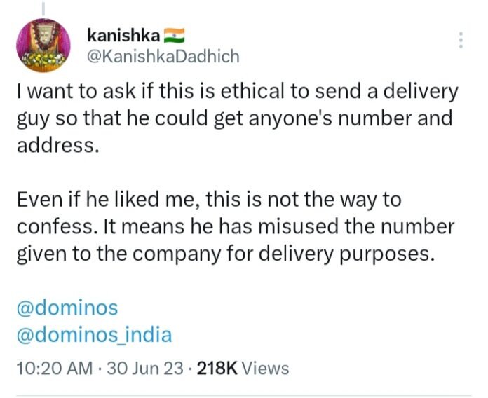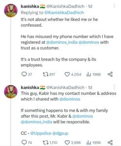 दरअसल कनिष्का नाम की एक महिला ने ट्विटर पर खुलासा किया कि उन्होंने डोमिनोज से ऑनलाइन एक पिज्जा मंगाया अगले दिन उसे डिलिवरी बॉय का मेसेज आया जिसमें उसने लिखा था- ‘सॉरी मेरा नाम कबीर है, कल मैं आपके यहां पिज्जा देने आया था मैं वही हूं मैं आपको पसंद करता हूं.’कनिष्का ने इस चैट के स्क्रीनशॉट को शेयर करते हुए लिखा ‘मैं पूछना चाहती हूं कि क्या किसी डिलीवरी बॉय को इसलिए भेजा जाता है, ताकि वह कस्टमर के नंबर और एड्रेस का गलत उपयोग करे. अगर ये लड़का मुझे पसंद करता भी है तो क्या कंपनी के जरिए फोन नंबर का दुरुपयोग करना ठीक है?’