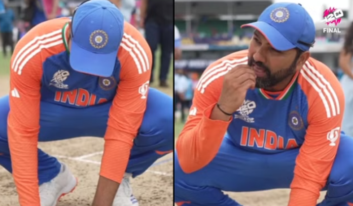 दक्षिण अफ्रीका को फाइनल मुकाबले में हराकर भारत 17 साल बाद एक बार फिर टी20 विश्व विजेता बना। शनिवार को बारबाडोस में खेले गए मुकाबले में भारत ने दक्षिण अफ्रीका को सात रनों से हरा दिया। विश्व विजेता का खिताब अपने नाम करने के बाद सभी भारतीय खिलाड़ियों के आंखों में खुशी के आंसू झलक रहे थे। इस जीत के साथ ही कप्तान रोहित शर्मा ने टी20 से संन्यास ले लिया। अपने आखिरी टी20 वर्ल्ड की जीत का जश्न उन्होंने बहुत ही खास अंदाज में मनाया। उन्होंने इस पल को हमेशा के लिए अपने अंदर समा कर रखने के लिए मैदान से मिट्टी उठाकर खा लिया।