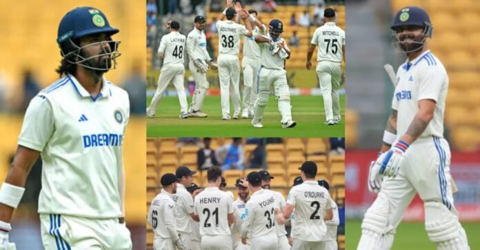 न्यूजीलैंड के खिलाफ शुरू हुए टेस्ट मैच में भारतीय टीम ने अपनी बेइज्जती करा ली है। बेंगलुरु में जारी इस टेस्ट मैच के दूसरे दिन पूरी भारतीय टीम सिर्फ 46 रन पर ऑलआउट हो गई। विराट कोहली जैसे दिग्गज खाता भी नहीं खोल पाए। विराट के अलावा  सरफराज खान, केएल राहुल, रवींद्र जडेजा और रविचंद्रन अश्विन जीरो पर आउट हुए। टीम की तरफ से सबसे अधिक ऋषभ पंत ने 20 रन बनाए। यशस्वी जायसवाल ने 13 रन बनाए। रोहित शर्मा दो रन और जसप्रीत बुमराह एक रन बनाकर आउट हुए। इसके साथ ही टीम इंडिया के नाम कई शर्मनाक रिकॉर्ड दर्ज हो गए हैं।