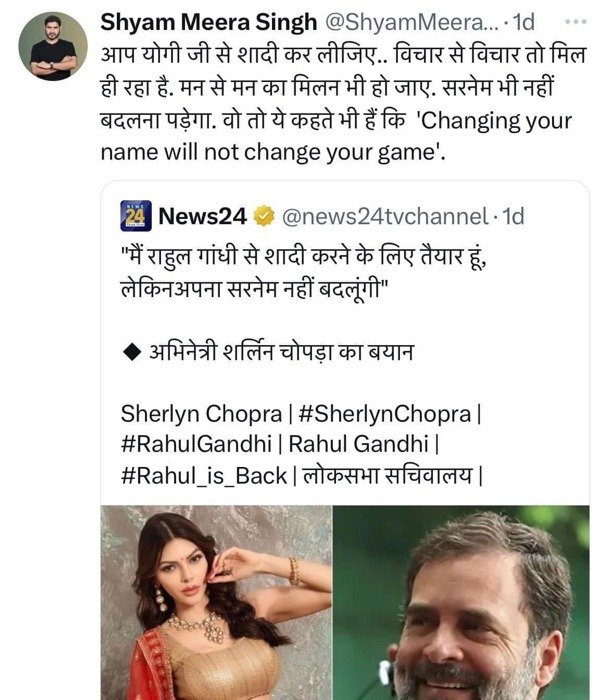 दरअसल, फिल्म अभिनेत्री शर्लिन चोपड़ा ने एक बयान दिया था कि, वह राहुल गांधी से शादी करने के लिए तैयार हैं, लेकिन अपना सरनेम नहीं बदलेंगी। इस बात पर एक चैनल ने खबर प्रकाशित कर दी थी। इसके अलावा श्याम मीरा सिंह ने इस ट्वीट को रीट्वीट करते हुए लिखा था- आप योगी जी से शादी कर लीजिए। विचार से विचार तो मिल ही रहा है। मन से मन का मिलन भी हो जाए। सरनेम भी नहीं बदलना पड़ेगा। वो तो ये कहते भी हैं कि, ‘Changing your name will not change your game’।